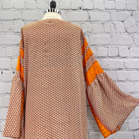 Billowy and romantic, this buttery soft blouse features a v-neckline and bell sleeves. Made from vintage rasgulla silk saris.