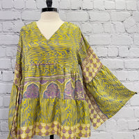 Billowy and romantic, this buttery soft blouse features a v-neckline and bell sleeves. Made from vintage rasgulla silk saris.