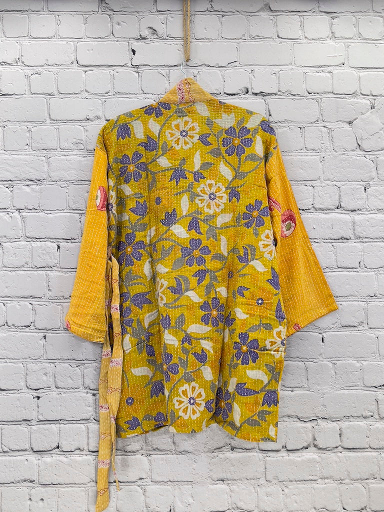 Relax in one of our unique kantha robes. This mid length robe is made of lightweight vintage cotton kantha embroidered saris. It features deep pockets and an attached belt.