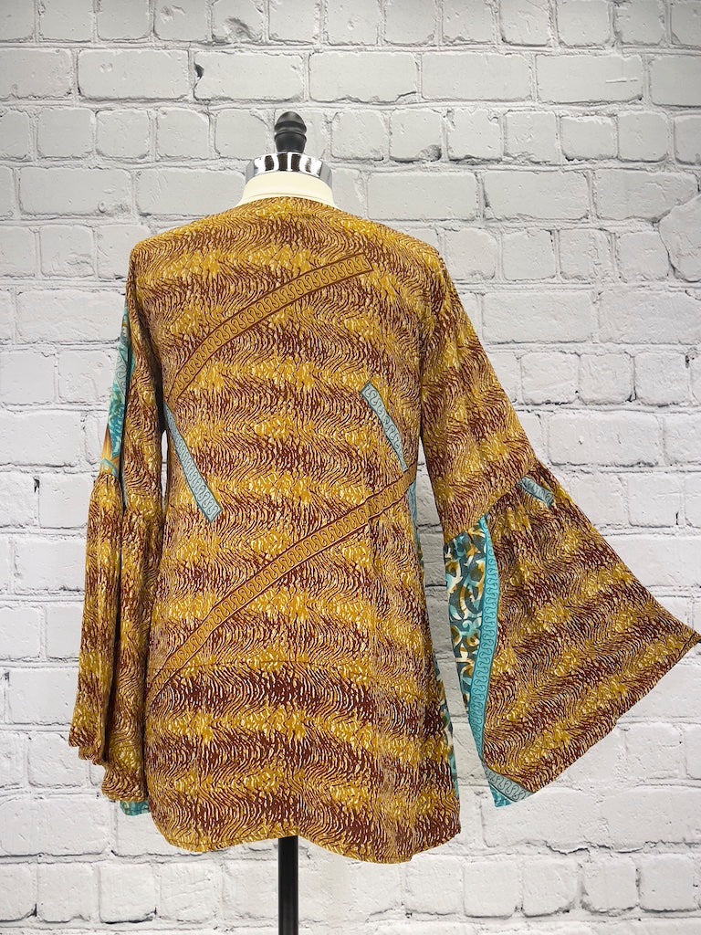 Billowy and romantic, this buttery soft blouse features a v-neckline and bell sleeves. Made from vintage rasgulla silk saris.
